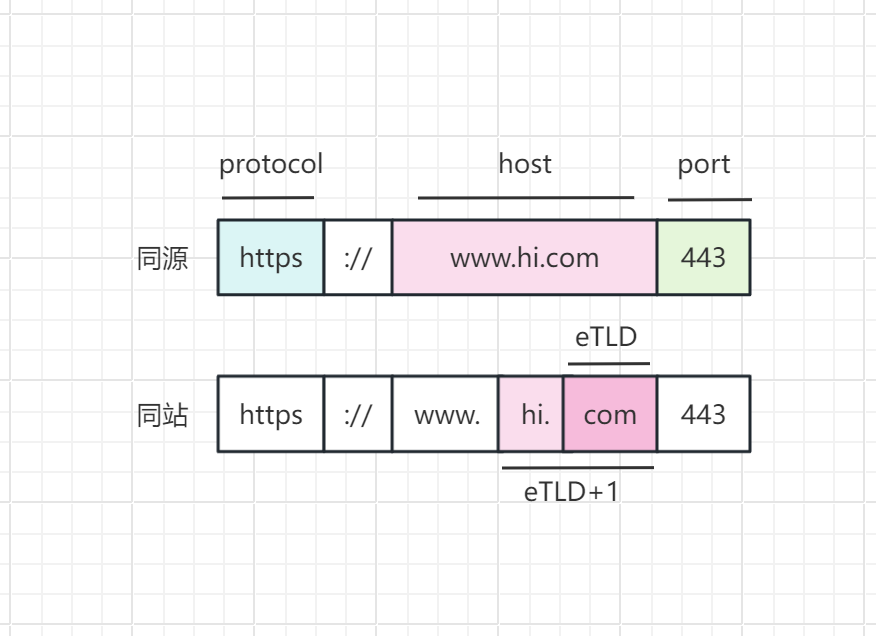 同站:有效顶级域名(Effective Top-Level-Domain,eTLD)和二级域名相同,则为同站。