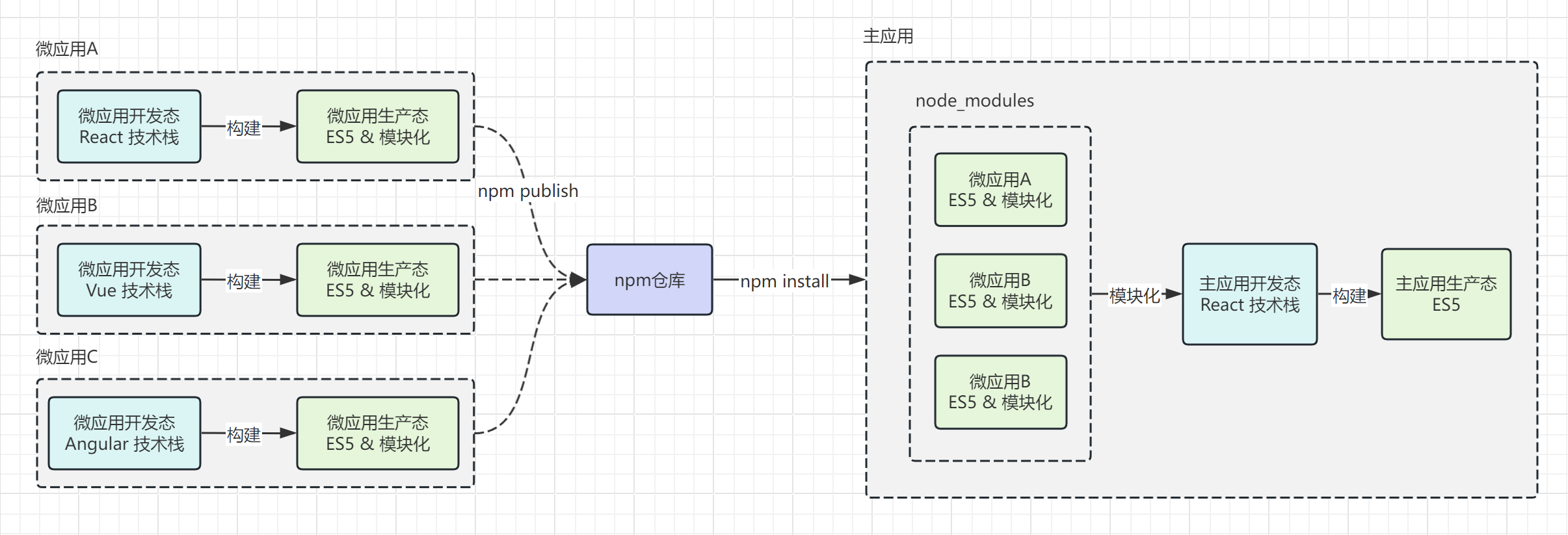 该方案将微应用打包成npm包,在主应用中引入和使用,需要了解模块化和构建相关的知识。