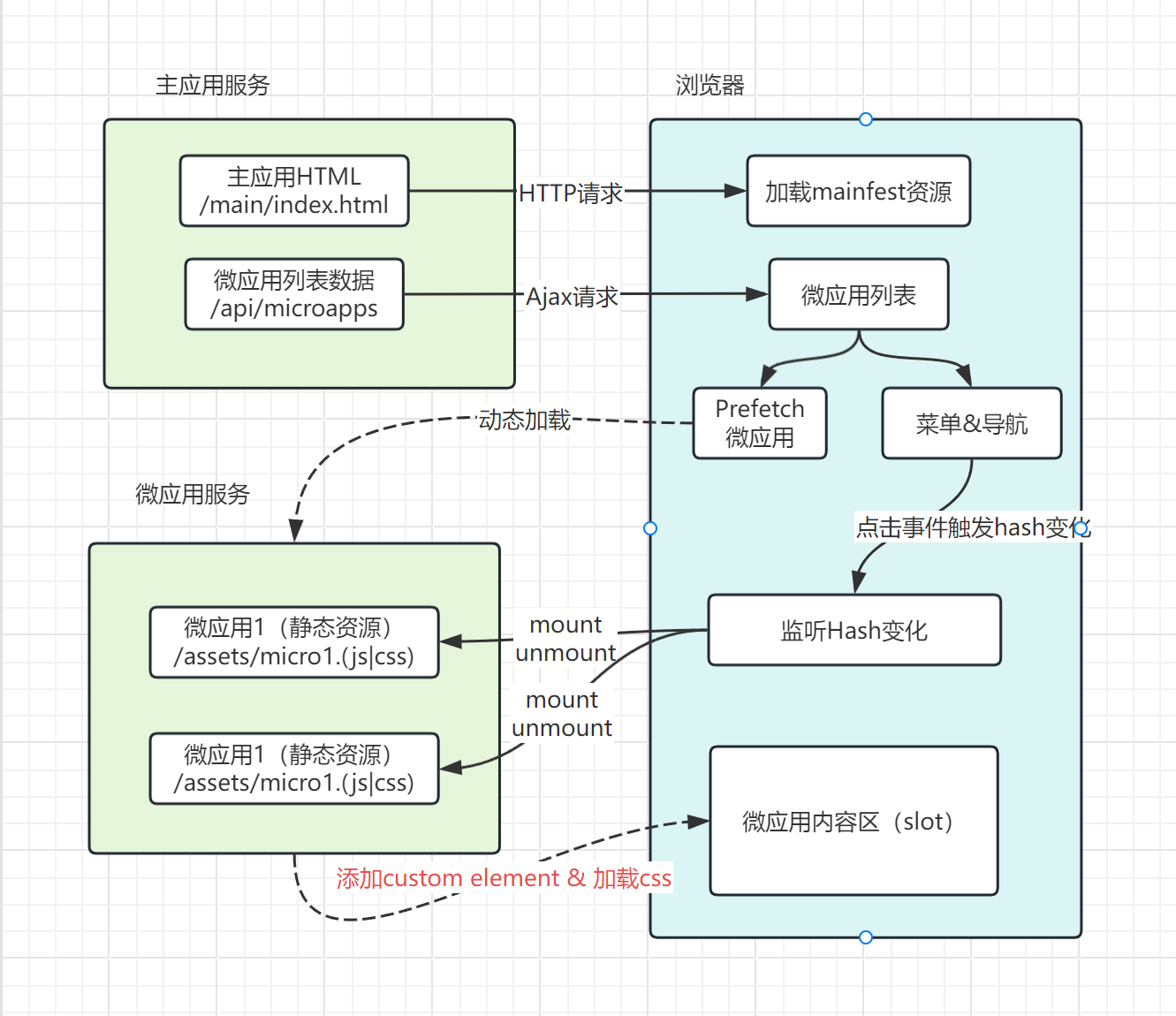 实现思路同之前的动态Script方案基本一样,区别在于如何挂载到微应用内容区。Web Components方案使用自定义元素来挂载微应用内容。