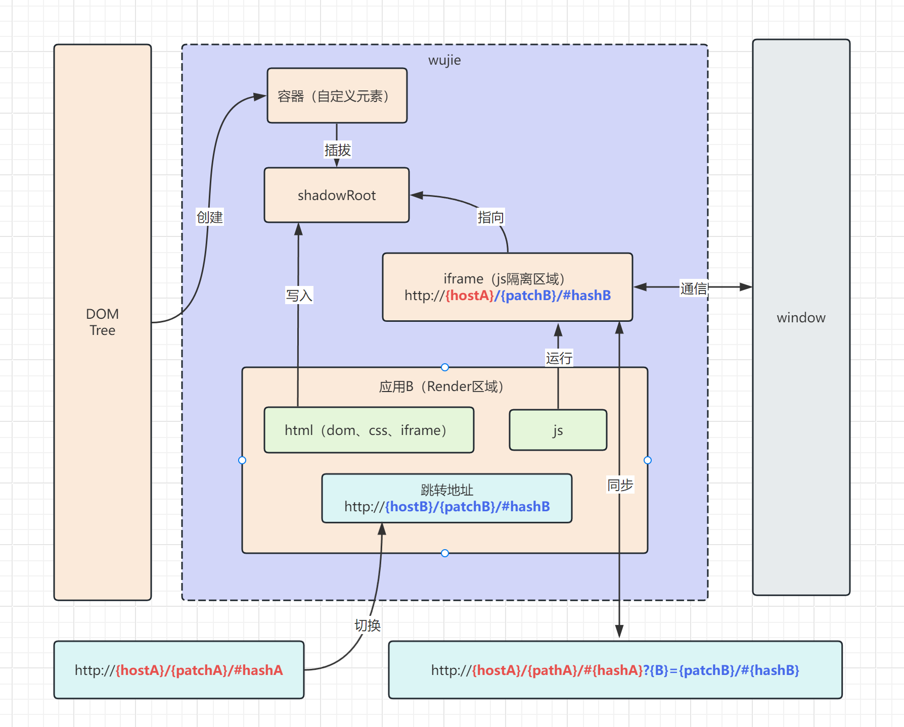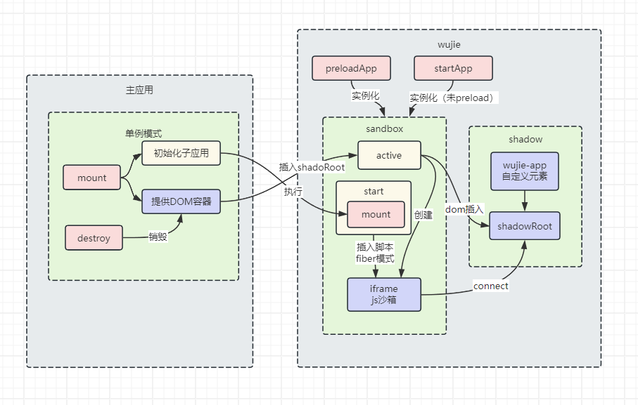 从上面框架运行图可以看出,子应用的shadowRoot和iframe和承载子应用的组件是解耦的,iframe中运行着子应用的实例instance。